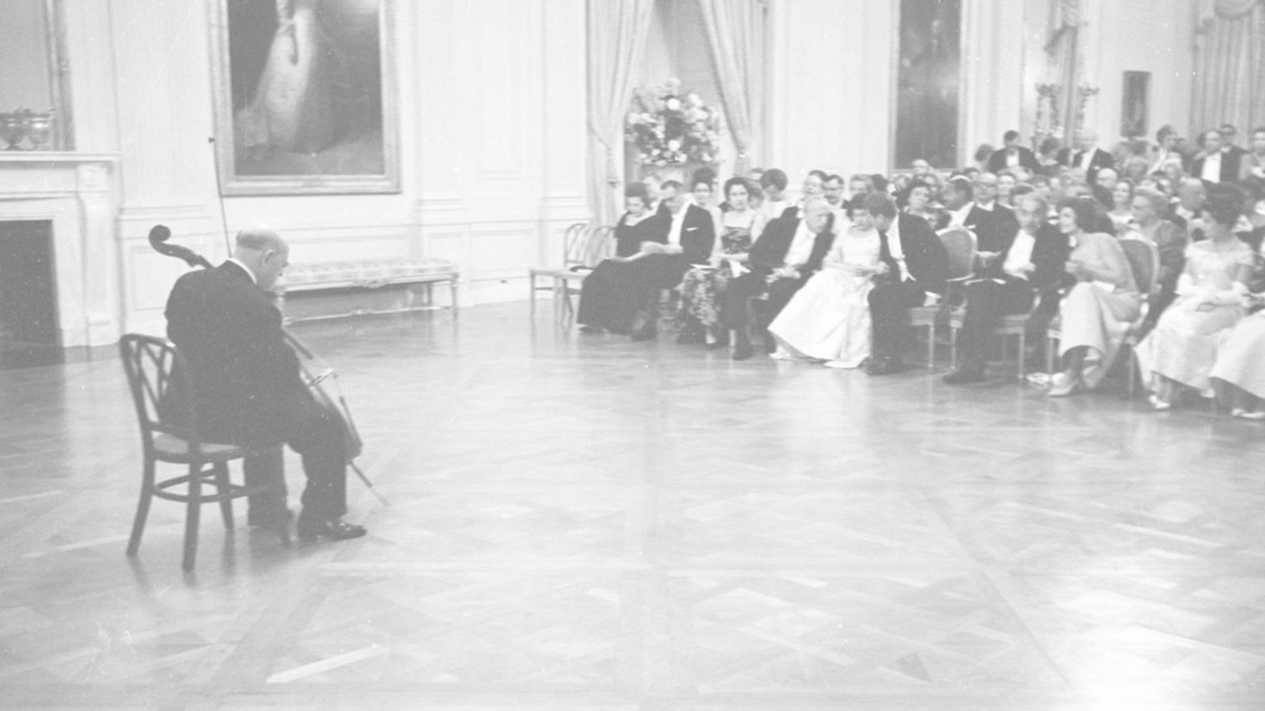 Pablo Casals performs “Song of the Birds” at the White House on November 13, 1961. (John F. Kennedy Presidential Library)
