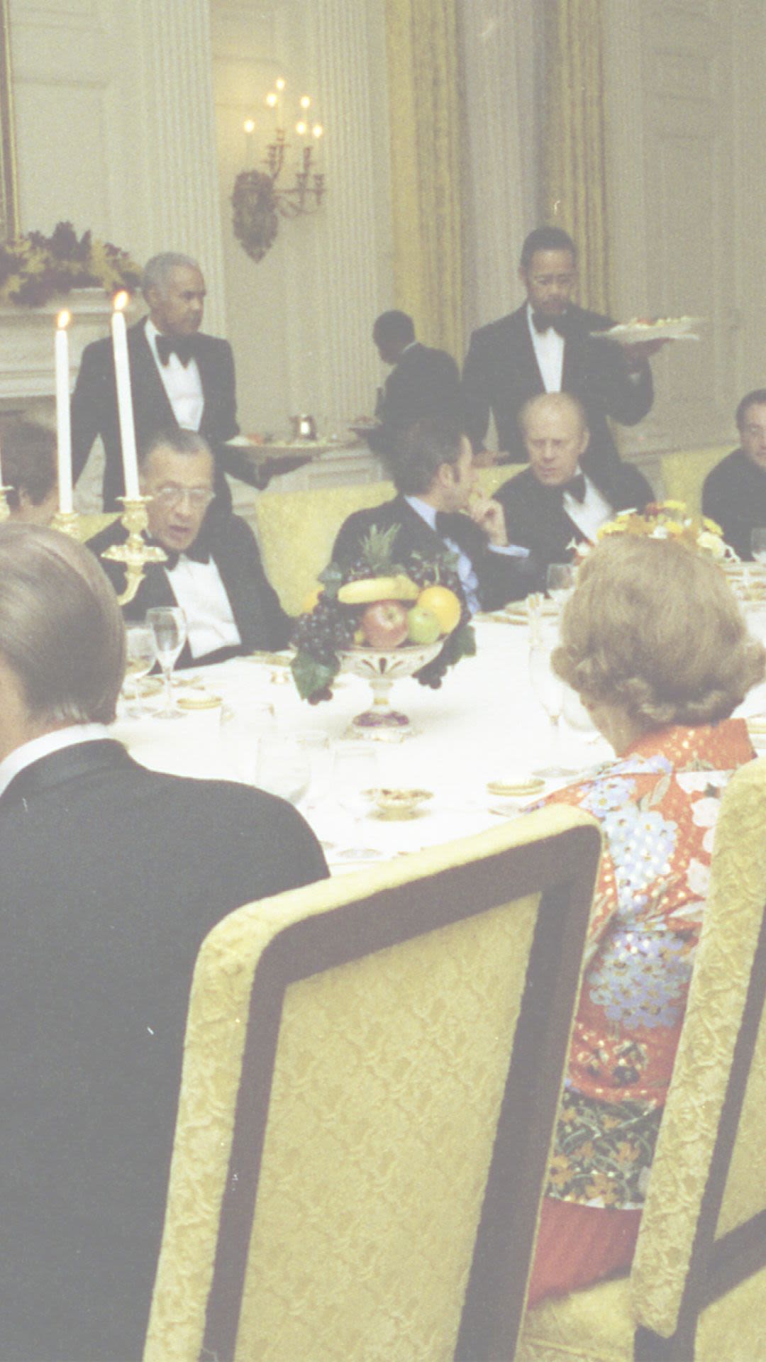 President Bill Clinton and first lady Hillary Rodham Clinton greet Nelson Mandela during a state dinner in his honor in 1994. (William J. Clinton Presidential Library & Museum)
