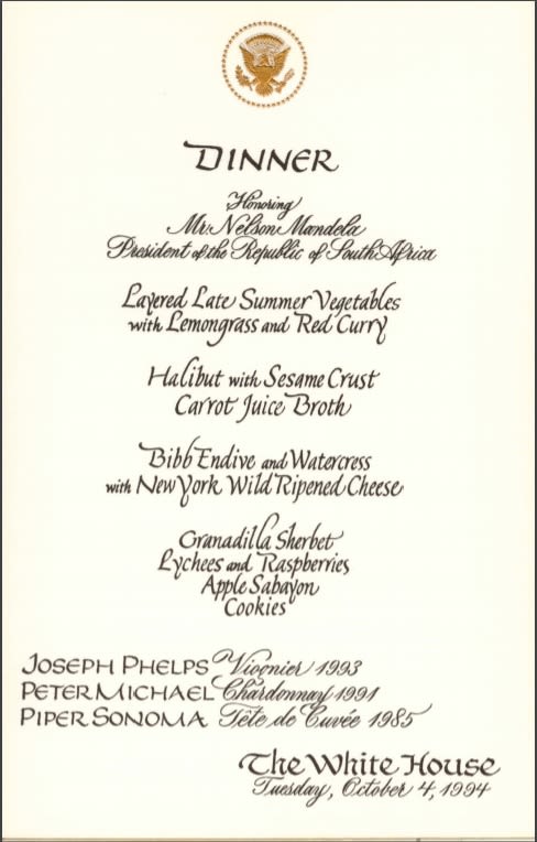 Nicely done! President Bill Clinton and first lady Hillary Clinton served this meal to Nelson Mandela, the newly elected and first Black president of South Africa. (Halibut is a popular dish in South Africa.) “As we break bread together … we are reminded of that which binds us, particularly the pursuit of freedom, justice and equality,” Mandela said at the dinner.
