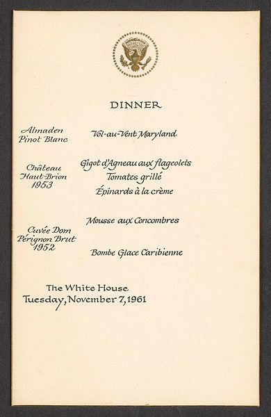 Very good, but can you read French? John F. Kennedy and first lady Jacqueline Kennedy served this to Indian Prime Minister Jawaharlal Nehru. Mrs. Kennedy was a Francophile and hired French American René Verdon as the White House chef. The menu for the evening listed each course’s items entirely in French.